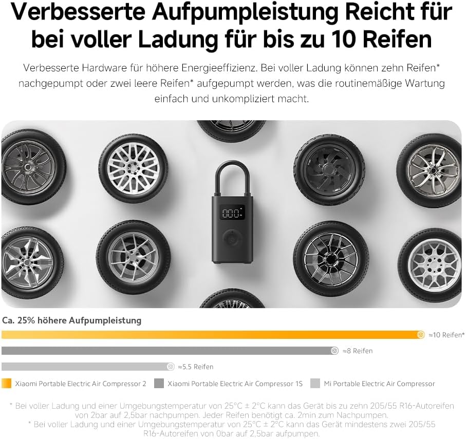 Bei voller Ladung können Sie bis zu 10 Reifen nachpumpen oder 2 leere Reifen komplett aufpumpen. Die verbesserte Hardware des Kompressors sorgt für eine höhere Energieeffizienz, sodass Sie mehrere Wartungsarbeiten ohne Nachladen durchführen können.