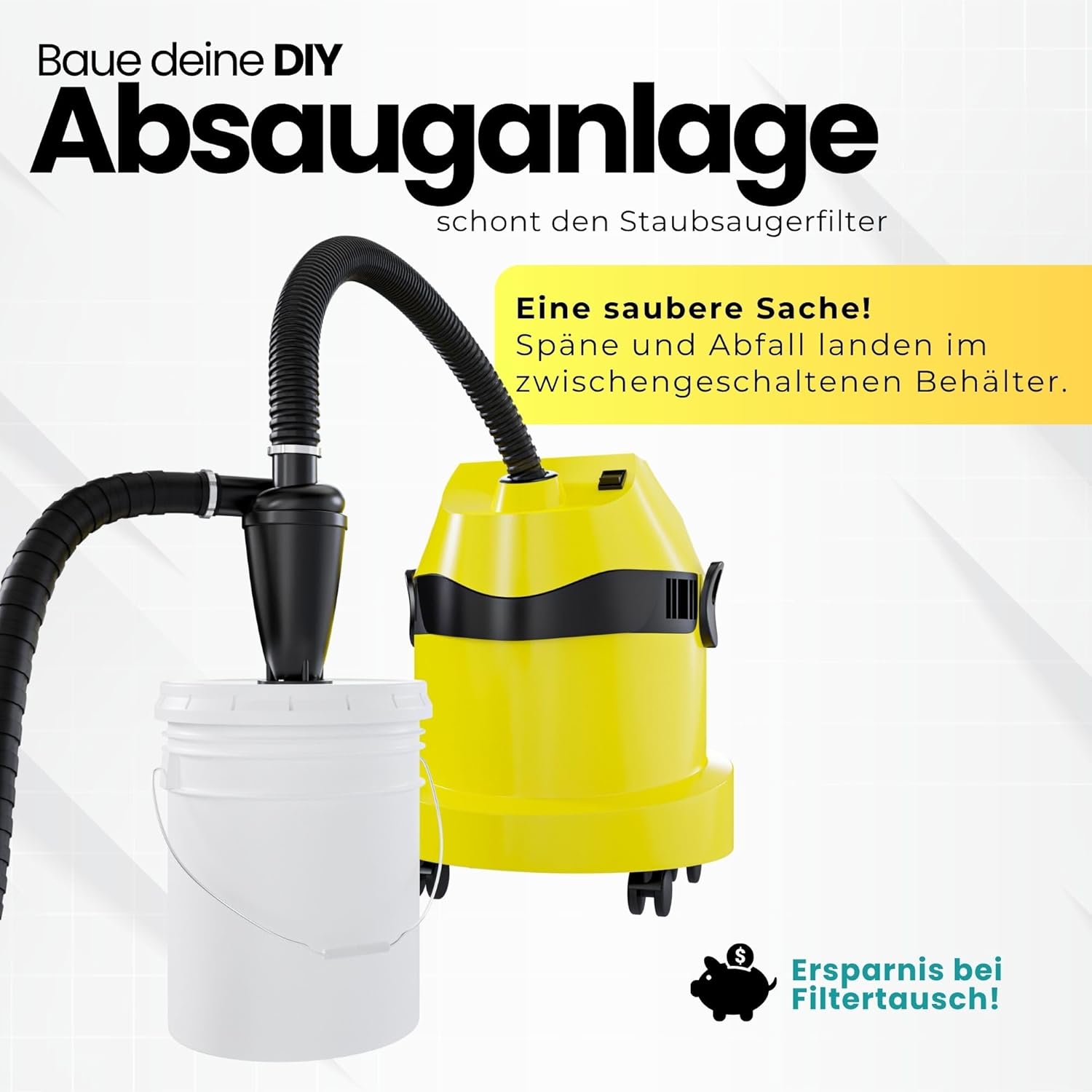 Dieser Zyklonabscheider ist die ideale Lösung für ambitionierte Heimwerker und Profis in der Holzbearbeitung, die ihre Werkstatt sauber halten und die Standzeit ihrer Filter verlängern wollen. Er dient als effizienter Vorabscheider, der den Grobschmutz aufhält, bevor dieser den Staubsauger erreicht, und so die Saugkraft dauerhaft auf einem hohen Niveau stabilisiert.