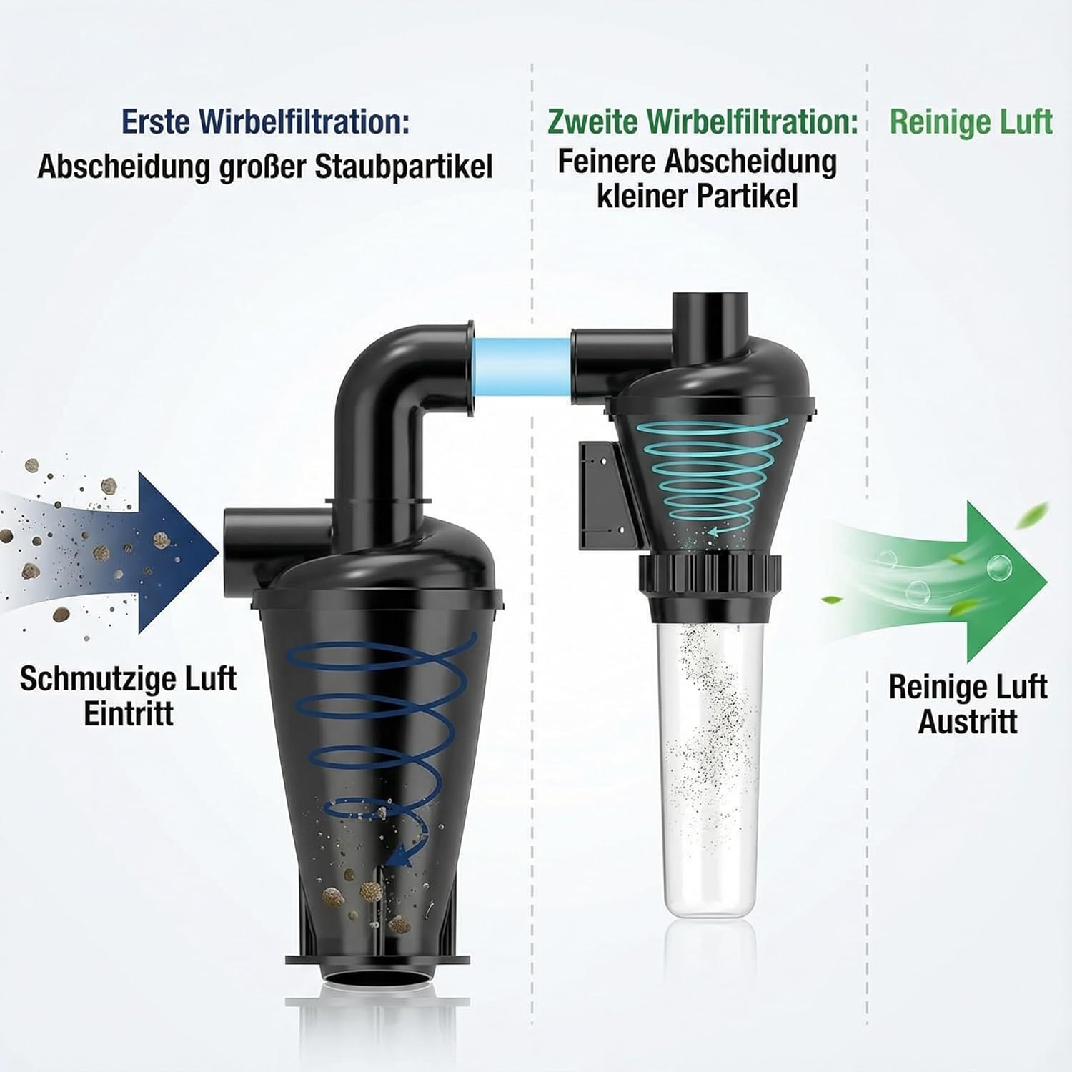 - Reinigung: Spüle den Zyklon bei Bedarf mit Wasser aus und lass ihn vollständig trocknen, bevor du ihn wieder in Betrieb nimmst.