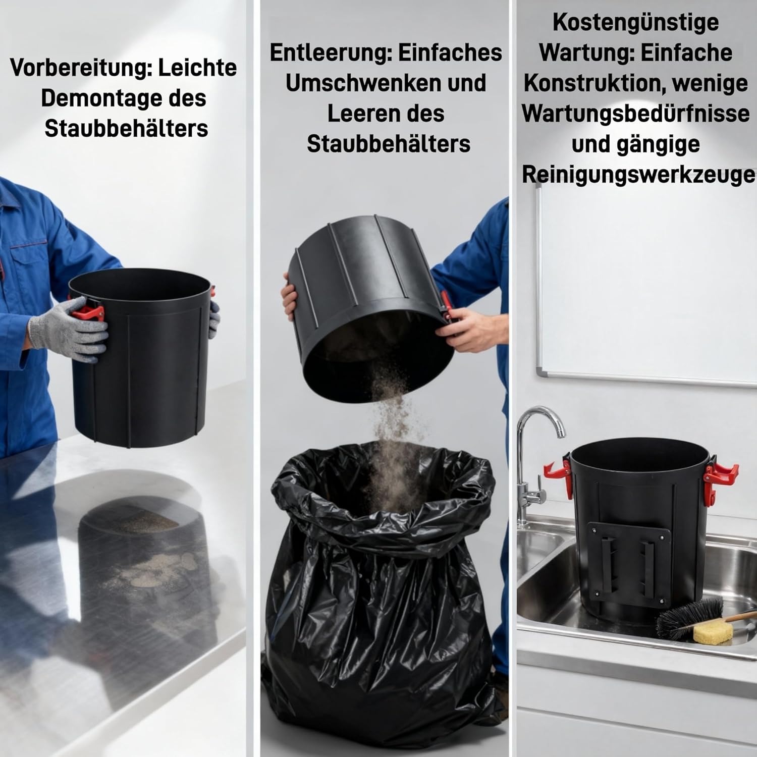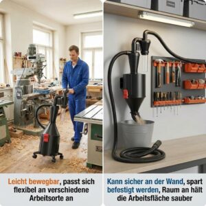 - Industrie-Kapazität: Das System ist für große Mengen an Spänen und Partikeln ausgelegt, die einen normalen Staubsauger sofort verstopfen würden.