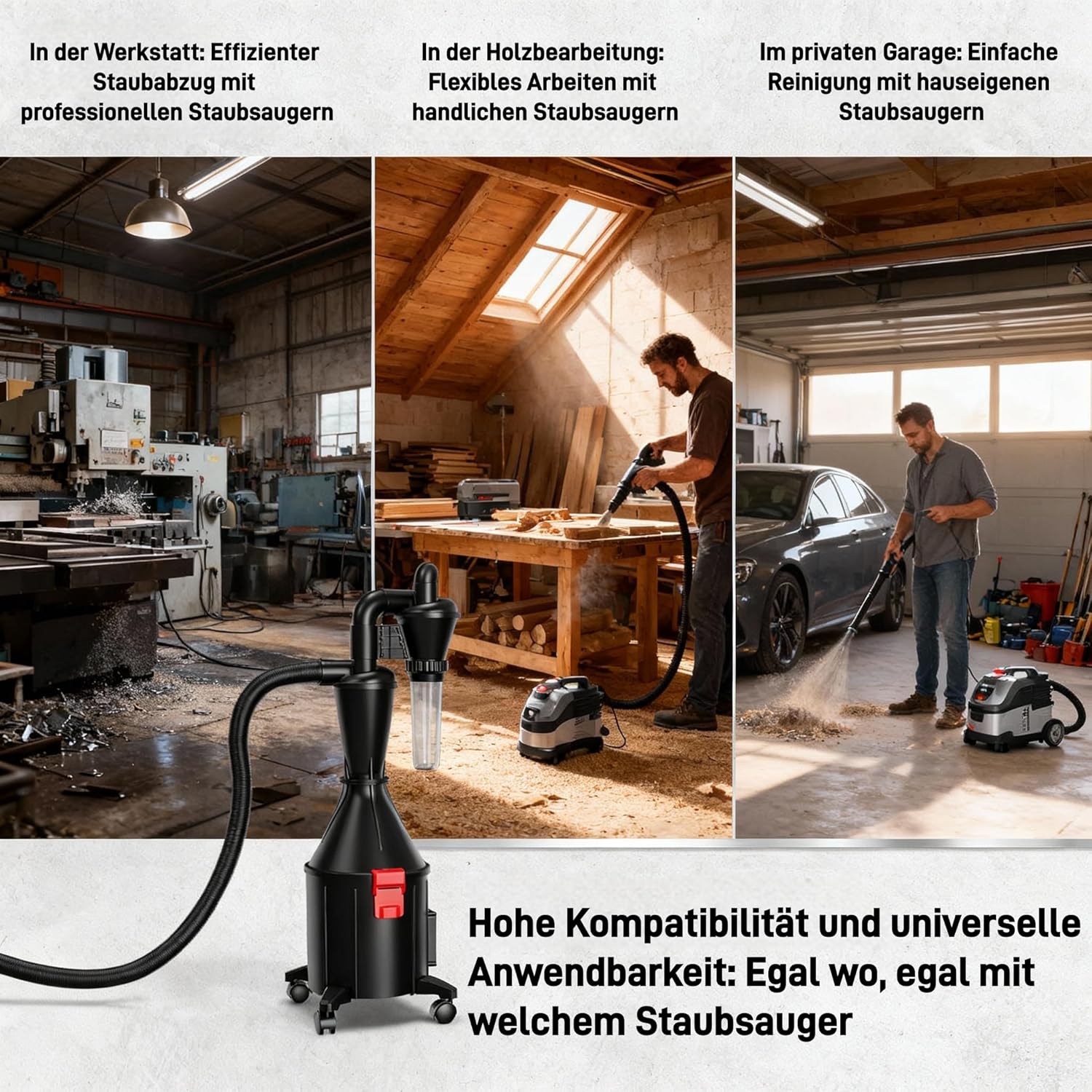 Dieser Zyklonabscheider mit Behälter ist die ideale Lösung für Profi-Handwerker und ambitionierte Hobby-Heimwerker, die ihre Saugkraft konstant halten wollen. Er filtert groben Schmutz und feine Partikel vor dem Staubsauger ab, was die Lebensdauer des Hauptfilters massiv verlängert und den Saugkraftverlust verhindert.